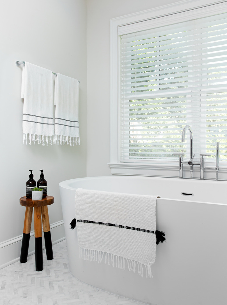 "If you love a more muted bronze-y, brass finish for your fixtures, don't feel the need to custom plate all your bathroom accessories because they aren't the exact same color," offers the designer. "Introduce other metal colors and embrace the depth it brings."