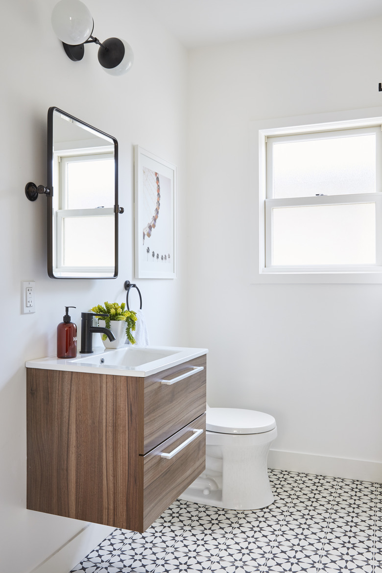 "It works great in small bathrooms since it takes it off the floor," divulges the designer. "They're easier to clean under and airier in general."