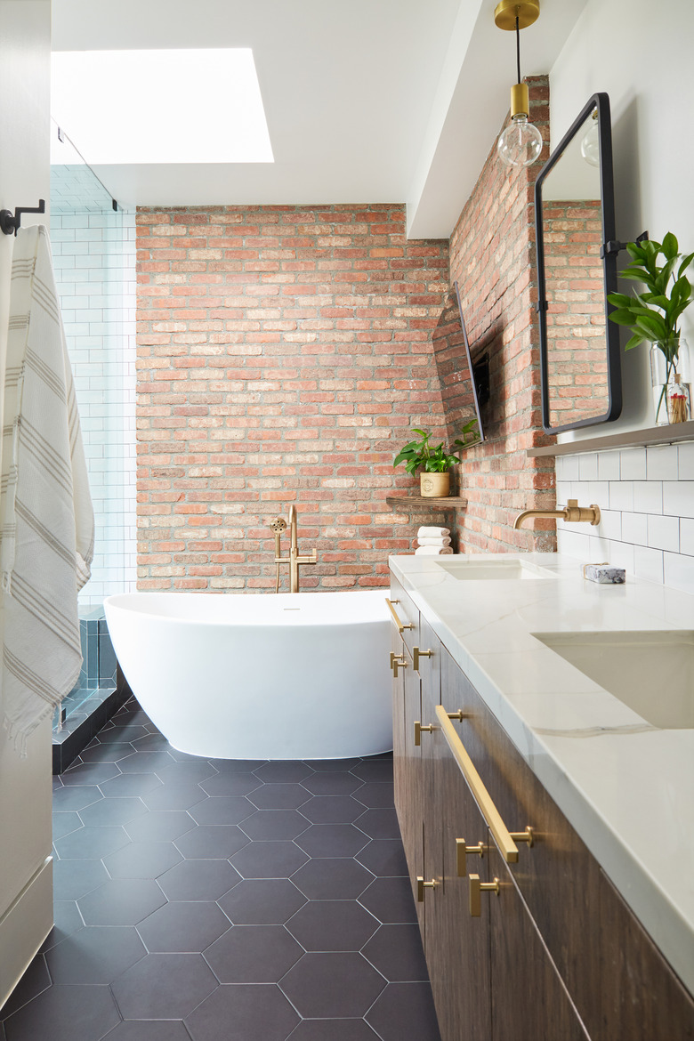 "Introduce some texture and color to your bathroom walls with shiplap, tongue, and groove paneling, exposed brick, etc. and don't be afraid to paint it if you want," says the designer. "It will give the bathroom an added element of design. Don't be afraid to bring color in with your fixtures, too!"
