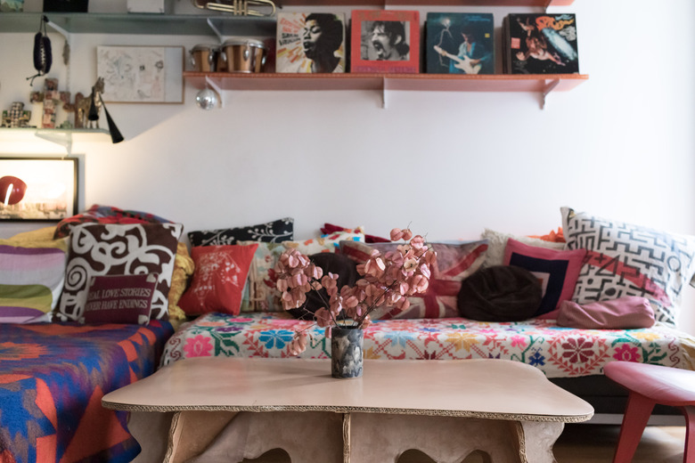 Below the far set of shelves is the family's lounge area inspired by Jimi Hendrix's Mayfair apartment, with an L-shaped couch, brightly patterned throw blankets, and equally vibrant pillows, as well as an assortment of chairs. A bright-red Eames LCW chair that used to be in former KCRW music director Nick Harcourt's office; stained bentwood chairs, made of a wood composite called Palmstrate, designed by friend Jonas Hauptman; and a wicker rocking chair from a garage sale add more personality to the space. There's also a bulbous lamp made of silkworms by Angus Hutcheson and an ultra cool coffee table of corrugated cardboard by Joel Stearns, who built cardboard furniture for Gehry in the '80s.