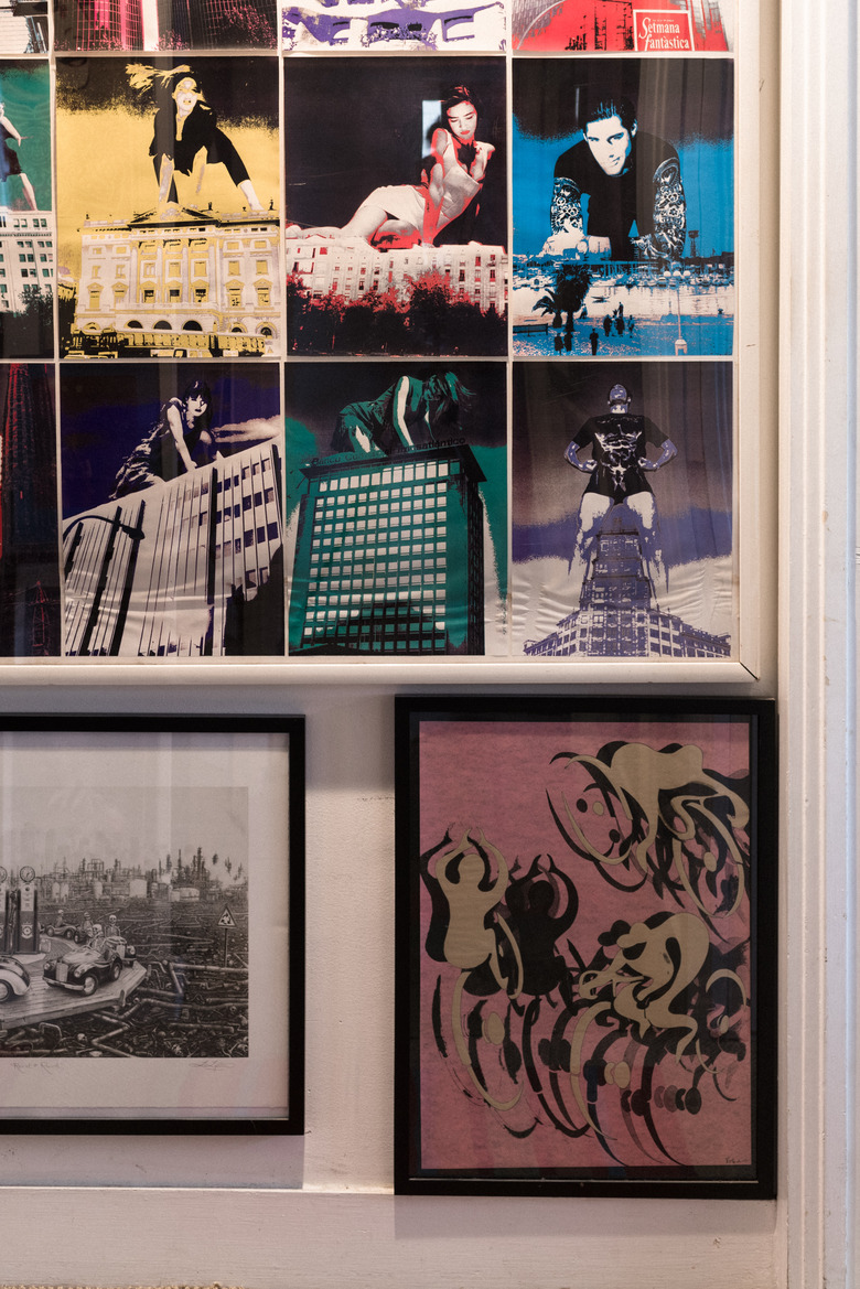 Through the hallway to their bedroom, practically every inch of wall is taken by more books and treasured artwork, including a signed poster from Shepard Fairey, a 1989 sketch of a teapot by Gehry with the personal note "A Teapot Named Frawncis" (to convey the English pronunciation of her name), '80s Xerox experiments by Anderton, and a poster she designed for the London Cycling Campaign. When asked which piece is her favorite, Anderton says, "Everything is a favorite." See, good friends.