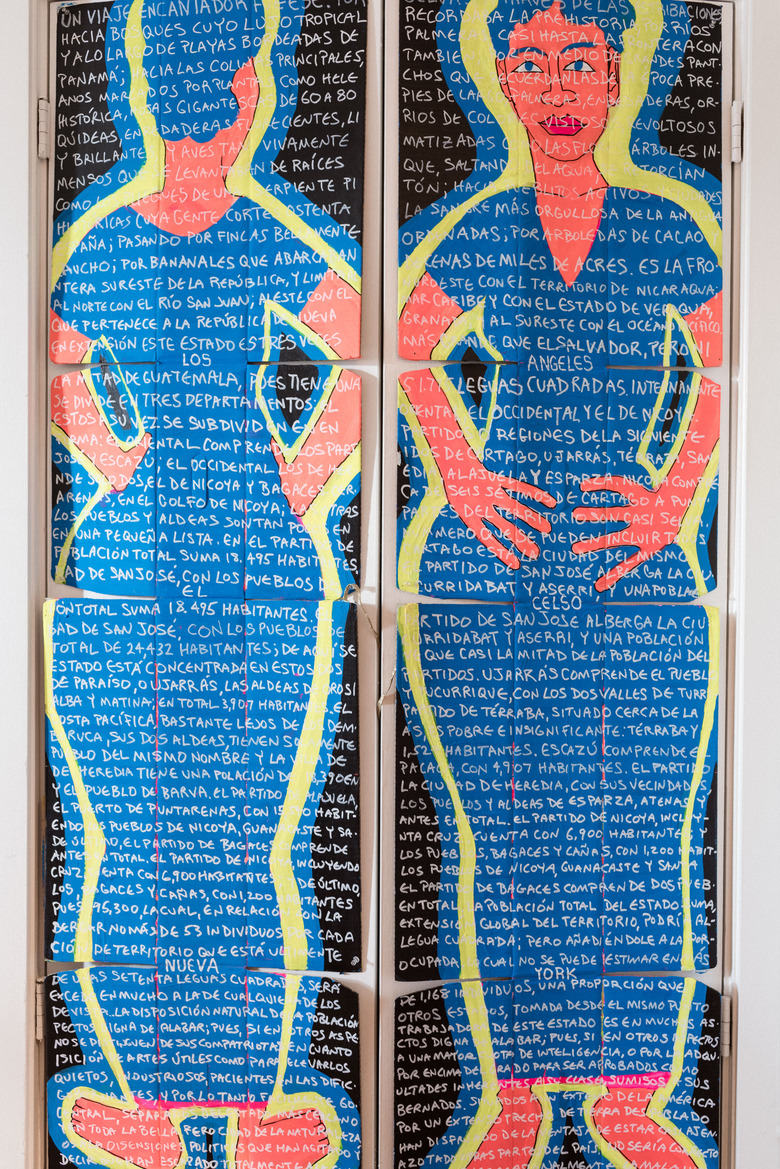 Other artwork in the family's home are by or feature Tyrone Drake, Catherine Opie, Peter Shire, Melinda Smith (below right), Laurie Lipton, Jay Mark Johnson, and Ben Medansky. The latest addition are bright, text-covered paintings of a woman by local artist Ed Tahaney placed over their entry closet doors (below left). The entryway itself serves as the family's pantry, with shelves of cookbooks and neatly ordered spices above an assortment of amplifiers. More colorful friends of all sizes and shapes.
