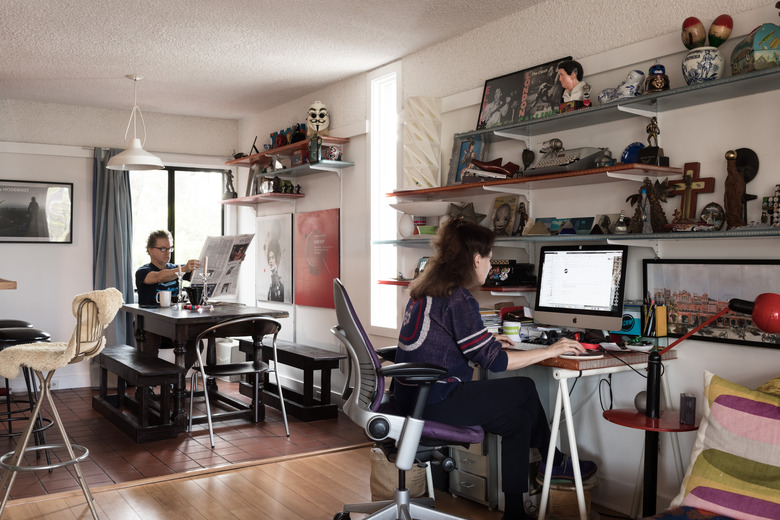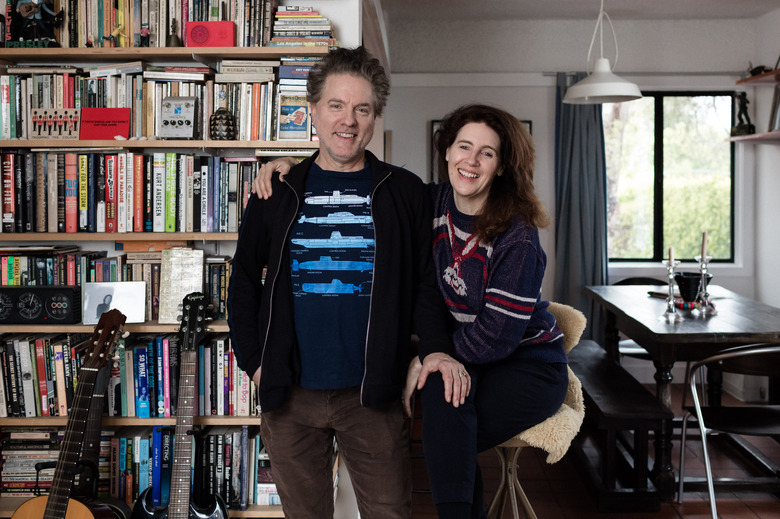 In large part thanks to her husband, musician and writer Robin Bennett Stein, loads of books, artwork, vinyl, music gear, gifted furniture, and garage sale finds fill the rooms — treated like good friends you keep for life. And what Bennett Stein does with these friends on his tchotchke wall in the living room is a constant source of amusement — and at times exasperation (at the sheer volume of tchotchkes) — for Anderton, "He just sees things at yard sales and puts them together in curious ways." His current "strange compositions" include a miniature hot rod wearing reading glasses, Mr. T struggling to get out of a top hat he shares with a grouchy wood mask (a Nigerian percussion instrument), an insect clinging onto an old Royal typewriter, and a plastic bottle of holy water adorned with Virgin Mary wearing a pocket watch. The cast of characters sit on different colored semitransparent plastic shelves that resemble honeycomb and are made of Panelite, invented by their friend and neighbor Emmanuelle Bourlier.