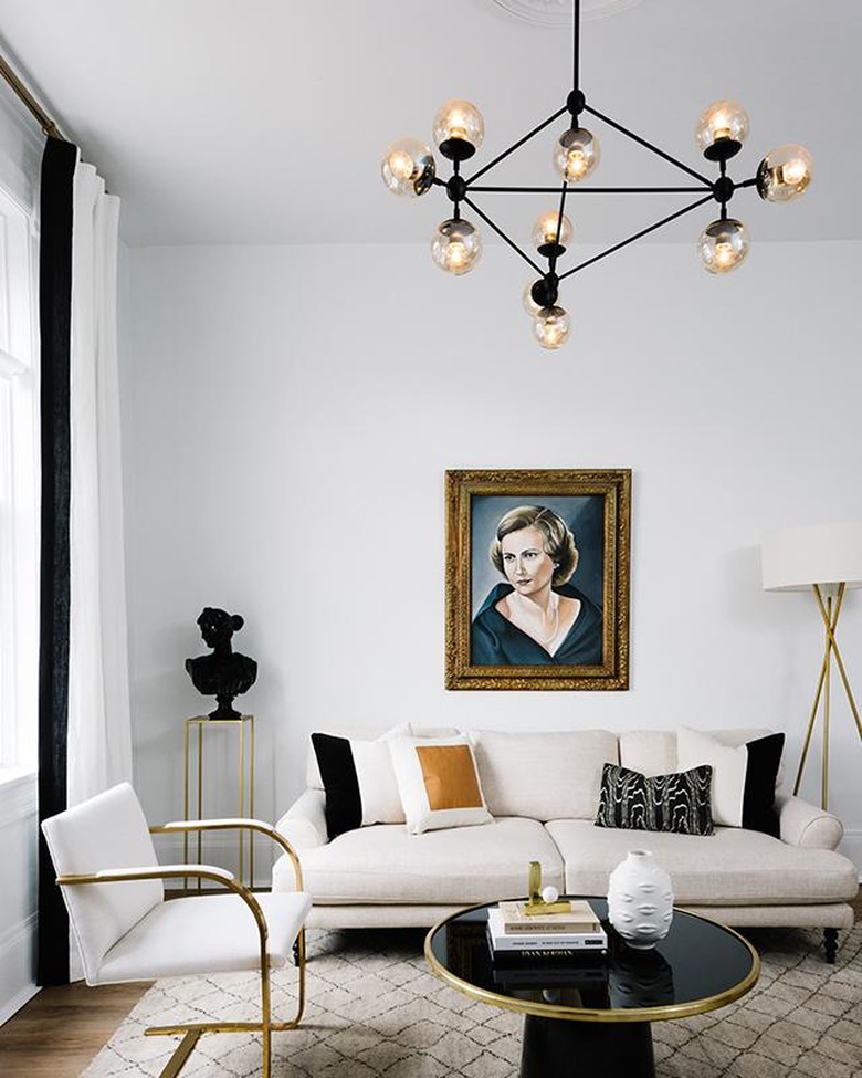 A midcentury light fixture brings instant, eye-catching drama to any space, as exemplified by this living room belonging to Havenly's head of design Shelby Girard. If you want to create striking aesthetics in your living room, start with a show-stopping midcentury chandelier and pair it with equally dramatic decor, like a bold oil painting and hints of black.