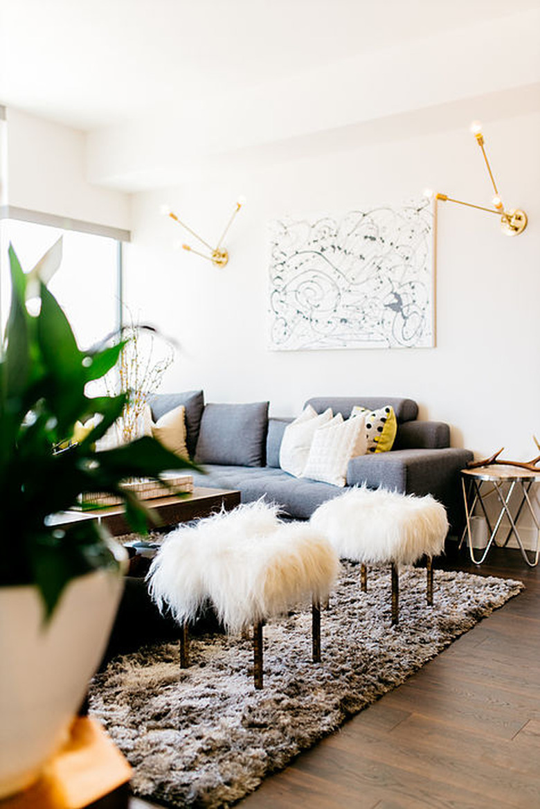 For something different, opt for living room lighting idea other than a chandelier or pendant light. Install midcentury wall sconces alongside your modern artwork, instead. The gold fixtures in this room designed by the team over at M. Swabb Interior Design look gorgeous next to the abstract painting hanging above the sofa.
