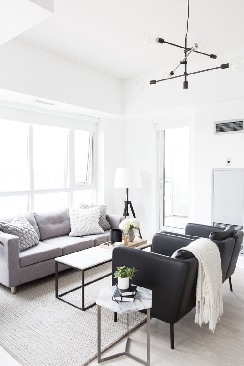 If you want to achieve cohesion with your living room lighting idea, match your midcentury chandelier to the metal finishes or colors seen throughout your space. In this living room belonging to Stephanie of SS Life + Style, a black fixture echoes the dark hues in the room.