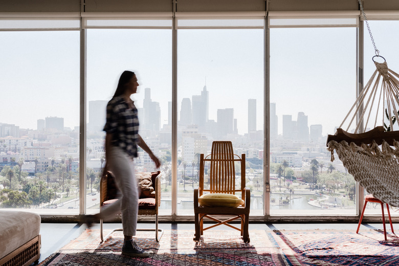For the last 11 years, she has lived in one of the most recognizable buildings on Wilshire Boulevard, the historic American Cement Company Building, constructed in 1961 as the company's headquarters, thus the cement latticework exterior to showcase its work. Now a live/work space, Alonzo actually had her eye on the building since she was a teenager: "I used to always drive by, and there was a number on the side of the building that I just started calling all the time" during her flip-phone days, she recalls. "I would call up and say, 'Hello, are there any units available for rent?' trying to sound like an adult," but for years, no such luck. Around 2008, a unit finally opened up that she lived in for a short time, until this one, a few stories higher, became available with quite the view.
