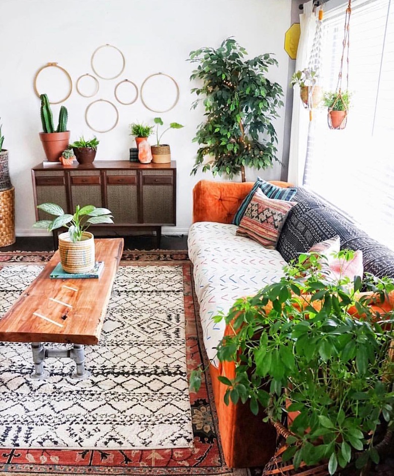 No matter what, orange is a color that will always stand out, especially when you choose an entirely orange sofa. If you're someone who loves go-big-or-go-home style, get inspired by this living room belonging to Camille of Bryant House. The velvet orange seat is draped in patterned textiles, which partner up nicely with the rest of the pattern-filled room.