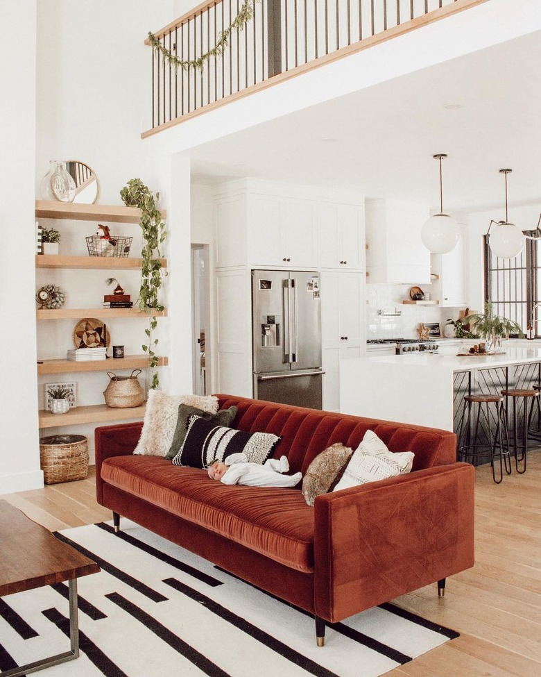 It might seem like a colorful sofa would look too showy in a room full of neutrals, but it turns out that the opposite is true. In fact, a vibrant sofa can have an anchoring effect that brings cohesion to a living room, proven by the rust-colored sofa showcased in Kassandra Dekoning's living room.