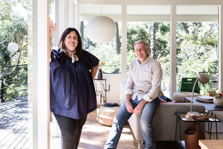 When graphic designer Lucy Gonzalez of environmental design firm Newsom Gonzalez and architect Brian Lane, principal at KoningEizenberg Architecture, first visited this midcentury home in 2000 as dinner guests, they instantly fell for its location in Beachwood Canyon. Set 30 steps up from the street, it is surrounded by lush landscape, easily viewed via the home's walls of glass and wraparound deck.