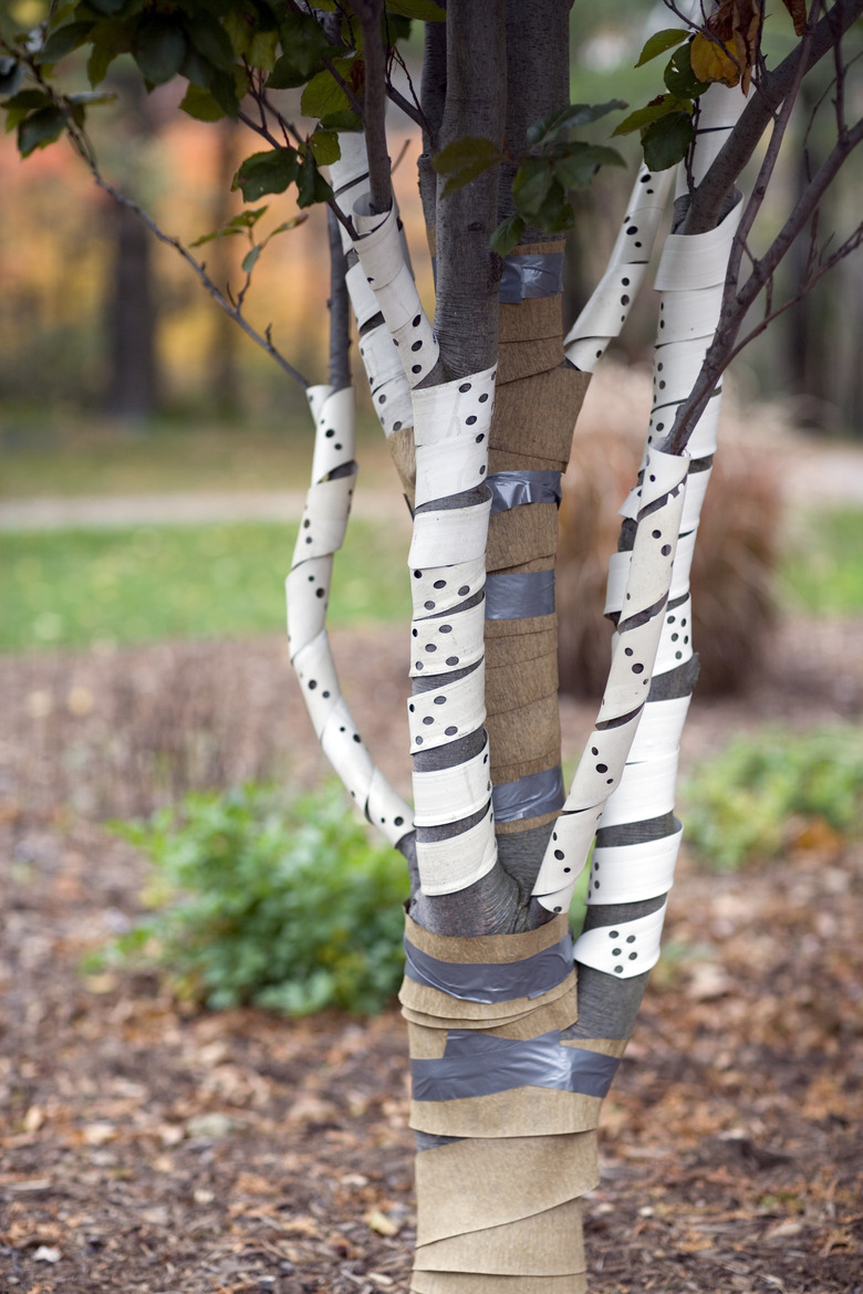 wrapped around stakes. - Wrap the lower trunk of young fruit trees with