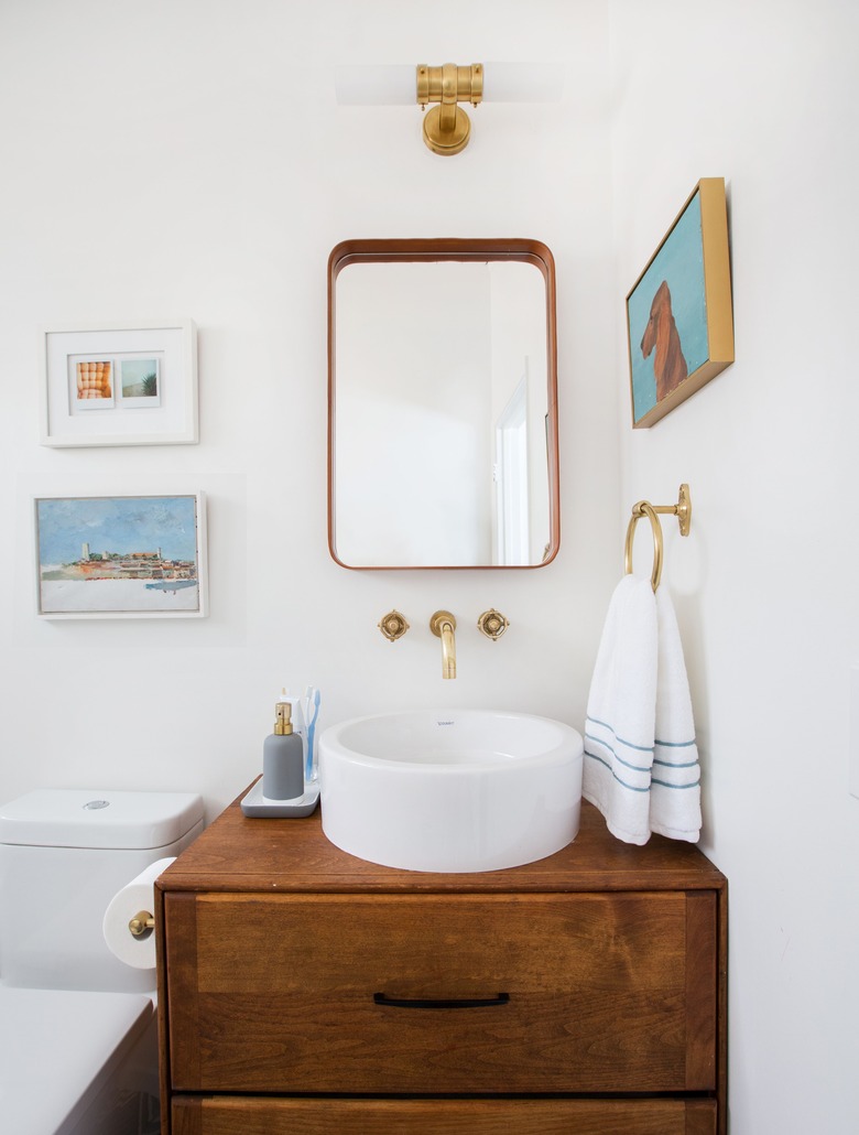 No room for a table? Don't give up on this guest bathroom idea just yet! See if you can squeeze a tiny stool in there somewhere to get the same effect (and at least a little storage), like in the gorgeous guest bathroom of Molly from Almost Makes Perfect.