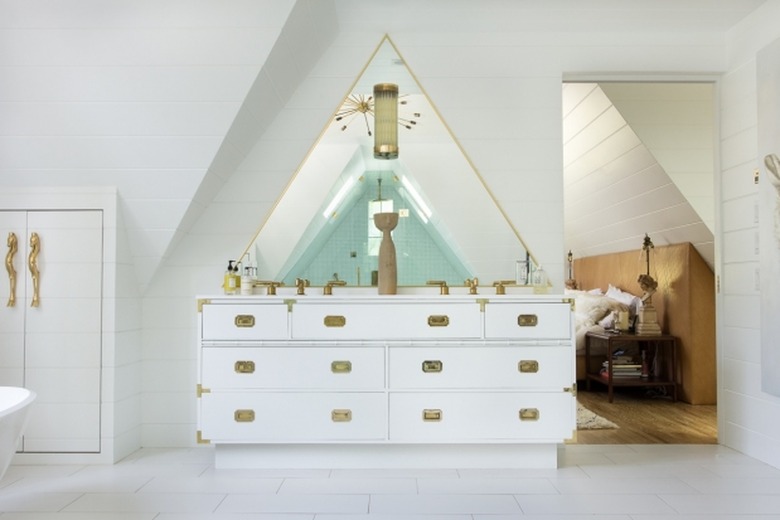 "Since most landlords won't allow you to knock down walls and make any permanent changes, you need to work with what you have and still allow yourself to get creative," says Bre Bertolini of Brepurposed. She suggests bringing in new hardware in the form of vanity drawer pulls, sconces, and even sinks and faucets (but keep the old ones). "Don't forget to mix metals — bringing in a new color with hardware can help modernize the space!"