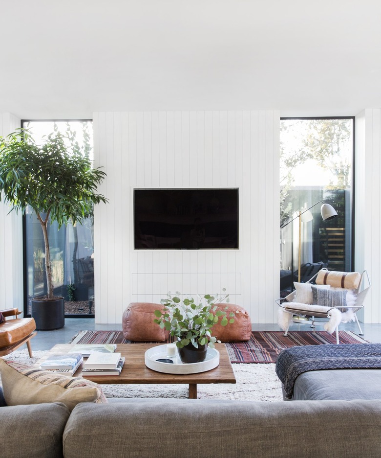 Ceramic tile surrounding a television makes the design choice feel considered and purposeful. This bohemian living room by Amber Lewis features a roomy sectional sofa to maximize seating (and offer a formidable vantage point to the TV), a mix of layered vintage rugs, leather poufs, and a measured dose of pattern and color to achieve the laid-back yet pulled-together look for which she is known.