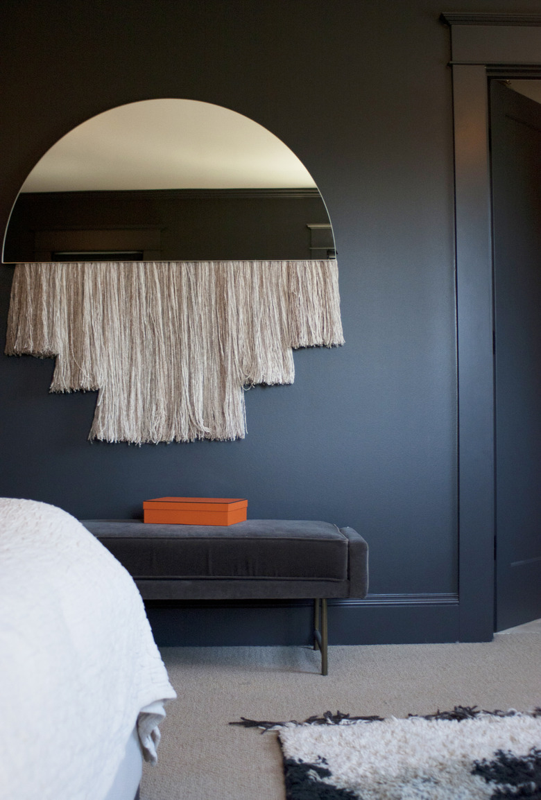 Walls painted in Benjamin Moore's Wrought Iron and gleaming brass elements help set the mood in the master bedroom. Bright Designlab designed the custom walnut dresser.
