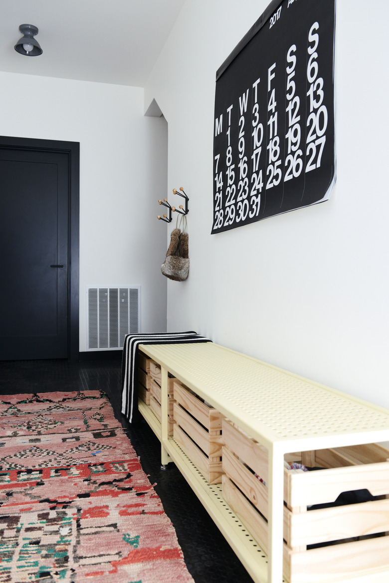 You'd never guess that the entry is lined with hospital-grade, slip resistant rubber floors — a big help during the snowy winter months. A Stendig calendar hangs above a custom bench and a runner from Kat + Maouche.