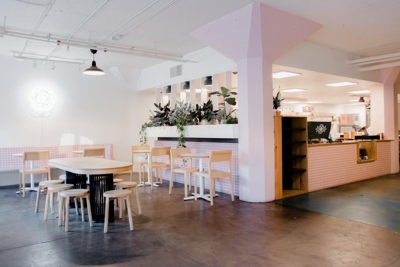 "As a repurposed warehouse, it's somewhat industrial and minimal," Harden says. "Camellia's design seeks to brighten and freshen up the market, taking inspiration from the namesake flower with light pinks, muted greens, bright whites, blonde wood, brass, and tropical plants."