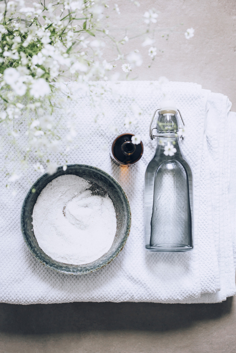 Once you have removed any hair and gunk from the drain, pour 1/2 cup of baking soda down the drain, followed by 1 cup of vinegar. Allow the mixture to fizz and get any mildew, debris, or clogs loose. Then flush the drain with warm water for a minute or two.