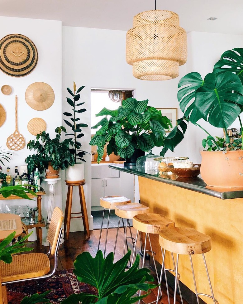 In a bohemian space, deck out your island in natural stone, warm woods, and light colors to imitate the rest of the kitchen. For instance, in this culinary refuge styled by Ron Goh, an organic-looking hub with a black countertop is an ideal addition. And it has plenty of room to display thriving green houseplants.