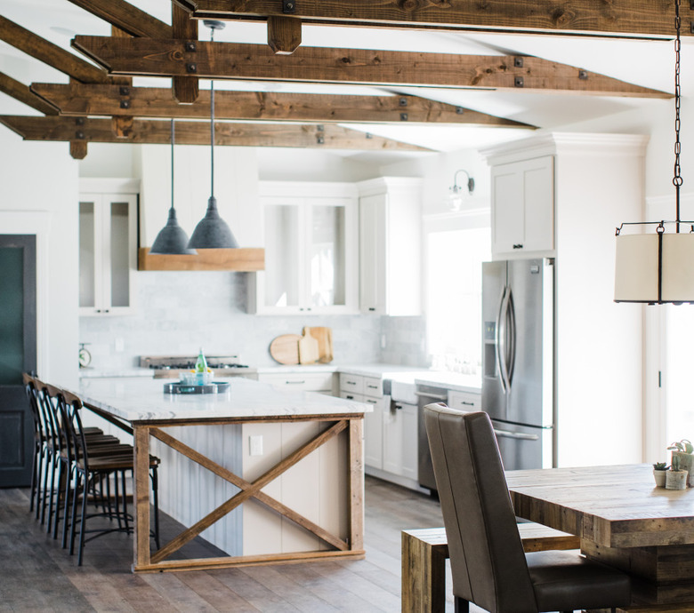 Joanna Gaines would undoubtedly sign off on this kitchen island idea, which is picture-perfect for farmhouse designs. For a similar look, follow the lead of the Rafterhouse team and incorporate stained wood, shiplap, and lots of white to complete your dreamy setup. We especially love the "X" shaped detail — reminiscent of bygone barn doors — that bookend the island. Swoon!