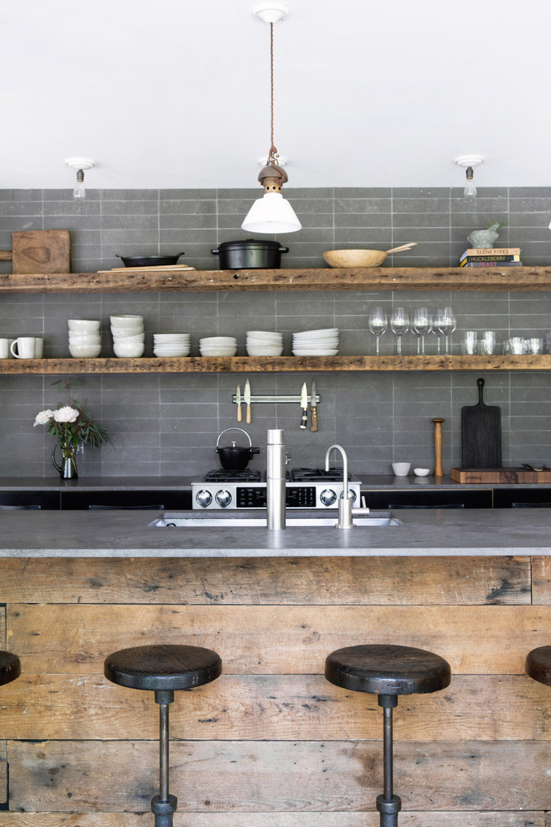 Industrial cook spaces can also benefit from kitchen islands rendered in well-loved wood — especially when outfitted with exposed pipes, stainless steel fixtures, reclaimed wood, raw materials, and natural stone. And this rustic design belonging to Athena Calderone is a picture-perfect example featuring a dreamy combination of lava stone countertops and rough-hewn reclaimed wood throughout.