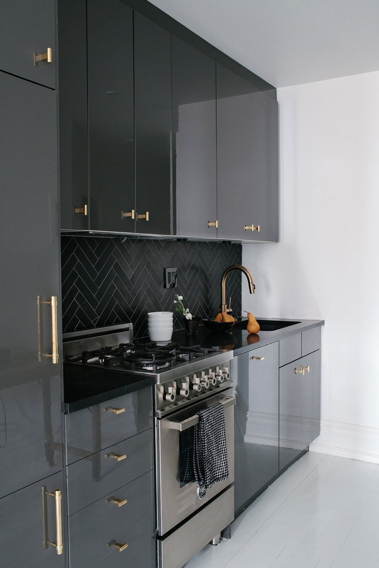 Forget traditional running and stacked bond tile layouts. Add drama to an already dramatic kitchen design with a black herringbone tile backsplash. The team over at BHDM Design took the luxe factor one step further with sleek high-gloss cabinets and brass hardware.
