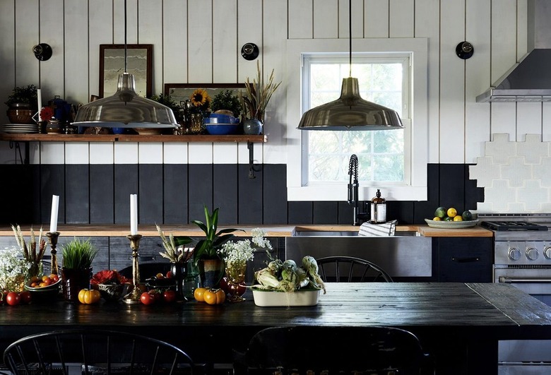 Leanne Ford knows a thing or two about creating inviting spaces that are equal parts aspirational and approachable. In this covetable kitchen, color blocking adds modern flair to the shiplap backsplash. The wall paneling, paired with other telltale farmhouse details — like the rustic table, wood countertops, apron front sink, and factory-inspired lighting — complete the pastoral look.