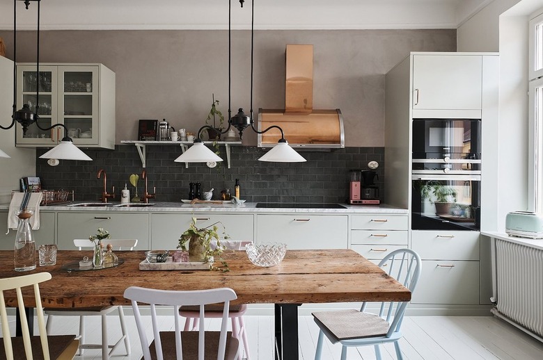 Black backsplashes are incredibly versatile. Need proof? Check out this kitchen styled by Mainstreet Stockholm flaunting a backdrop made up of glass subway tile and a plaster wall finish. The cool hue of the cabinets and the pastel dining chairs complement the cool Scandi vibe, while a rustic wood table and copper accents — like the range hood, hardware, and faucet — add just the right dose of warmth.