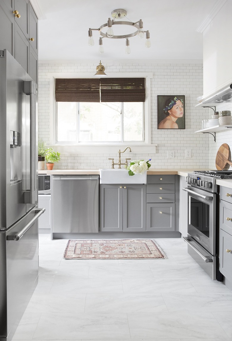 Here, Keyanna Bowen of East + Lane used kitchen vinyl flooring stickers in a Nordic-inspired pattern to infuse Scandinavian style into a small space. The neutral pattern perfectly plays off the farmhouse-evoking butcher block counters, simple white cabinets, and beadboard paneling. A tulip dining table and rattan-framed bistro chairs lend a bit of French country flair to the space.