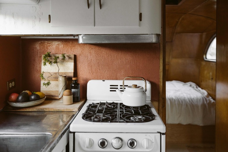 With Dixie's rounded edges and original wood paneling, Brown felt the bones were in solid shape. "We could tell there was so much potential behind the grime," she says. They kept the 1950s paneling, appliances, and cupboards in the kitchen but changed pretty much everything else. The goal was to keep the trailer as simple as possible. "We both really like a natural feel and always try to mix some rustic elements in with clean and minimal designs," Brown shares. Ehrecke built a bed frame with sliding drawers for storage underneath, a maple dining bar, a small desk where Brown can work, and a built-in sectional for lounging.