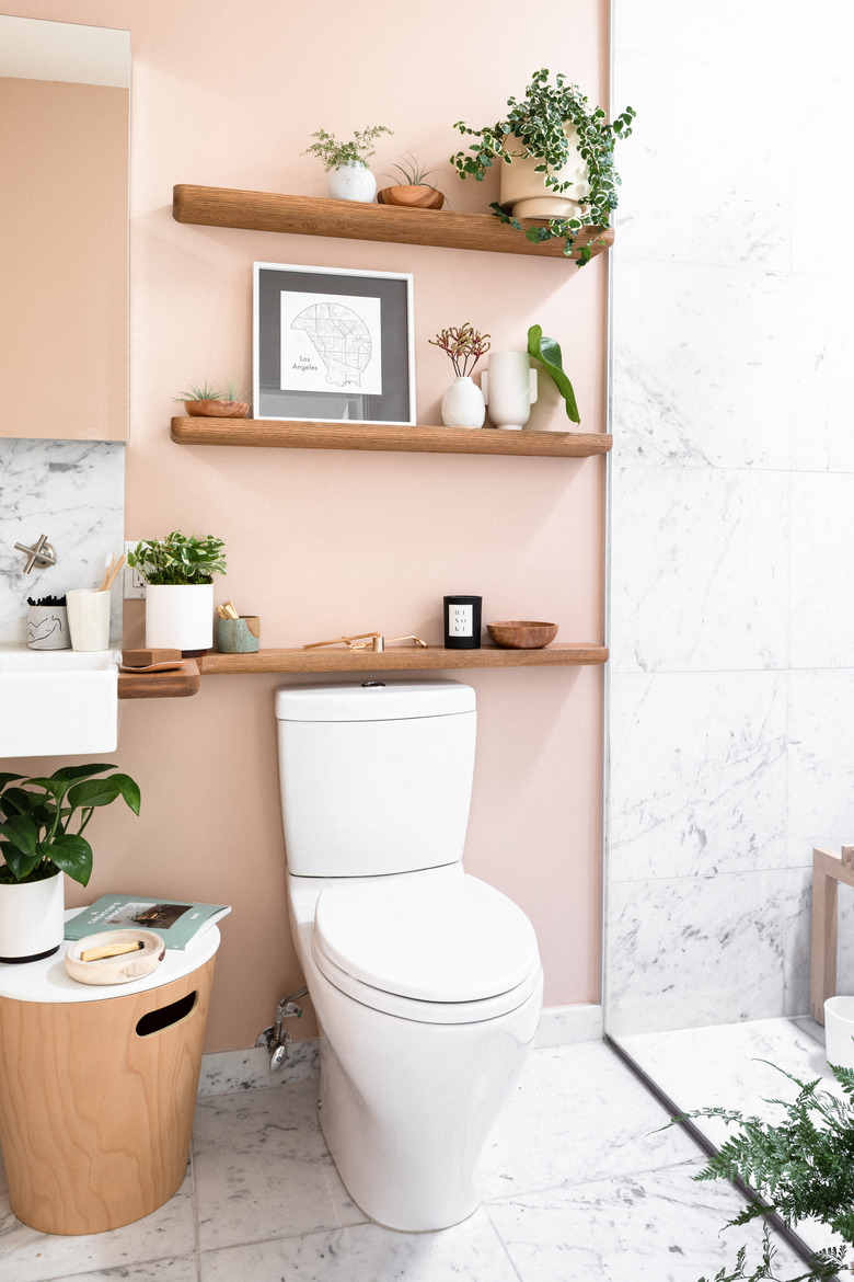 For our new bathroom look, we added a coat of muted peach paint and brought in open wood shelving to display a variety of planters, candles, vases, and accessories. If you're feeling inspired to bring the look to your own home, scroll on down to shop the images below, or check out our curation on Suitely.