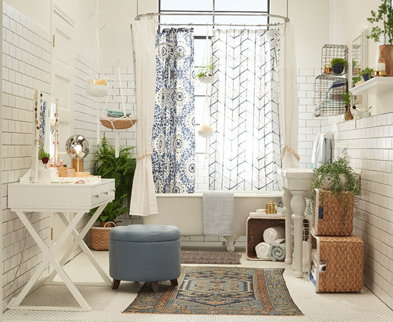 You would absolutely layer throw blankets and accent pillows in a bohemian living room, so why should your bathroom be any different? In this inviting sanctuary, interior designer Emily Henderson layered mismatched shower curtains, patterned rugs, and lush greenery to complete this eclectic look.