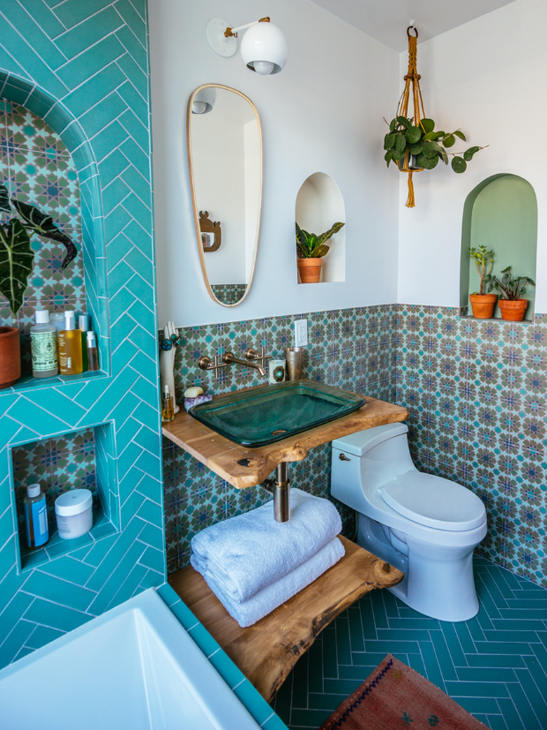 Attention all maximalists: Now's your chance to go big or go home. We love the use of bold colors, patterned floor and wall tile, and rustic accessories in Justina Blakeney's aqua blue bathroom. Go ahead, be a little extra; that's what la vie boheme is all about.