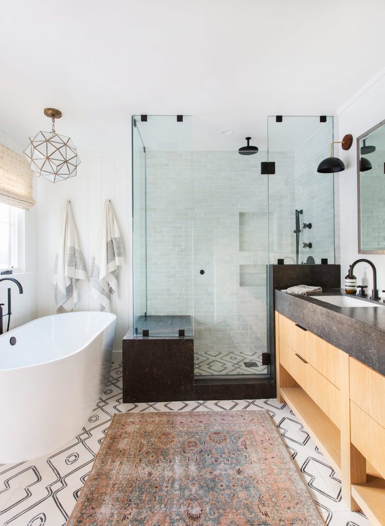 Take a cue from designer Amber Lewis and envelope your bathroom with an array of interesting pieces, like the multi-faceted pendant light, vintage rug, or patterned floor tile that she used to create an effortlessly chic refuge.