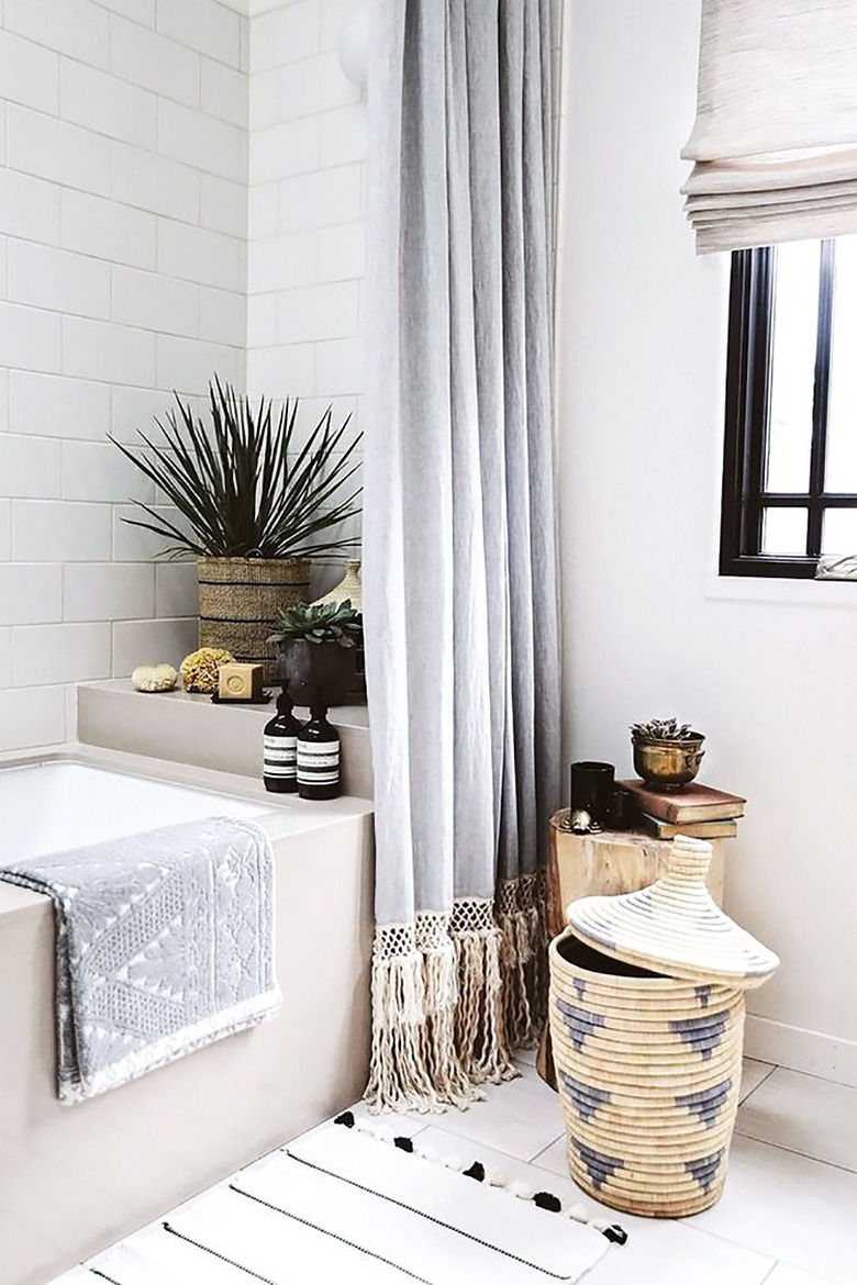 Want to bring a dash of bohemian spirit into your bathroom on a budget? Pick up some whimsical accessories. Kasie of Musings on Momentum outfitted her space with casually stacked books, a fringe shower curtain, and woven baskets.