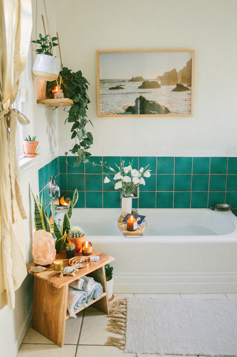 No bohemian bathroom idea would be complete without a few strategically placed plants. The range of hanging planters, succulents, and leafy greens in this bathroom belonging to Sara from Black and Blooms injects some much-needed life into the space — literally and figuratively.