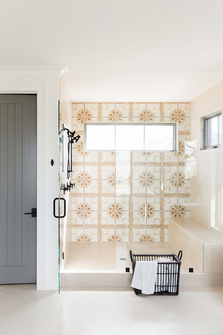 If you're dipping your toes into the bohemian bathroom pool for the very first time, play it safe by adding a fun wall tile to your shower area. As this space designed by Shea from Studio McGee proves, it's a great way to inject a little boho-chic charm into your otherwise minimalist washroom.