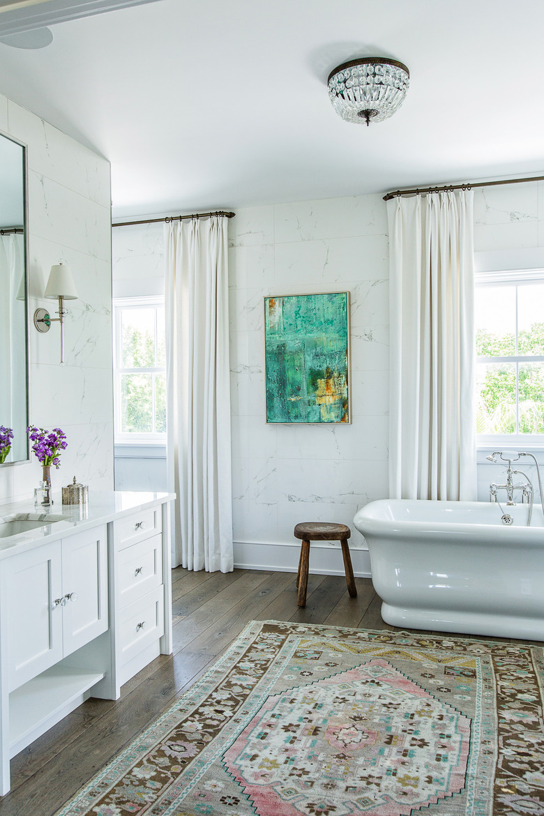 "In all of the spaces that I design, I like to have multiple levels of light," says designer Katja van der Loo of Papyrus Home Design. "A center fixture, such as a chandelier or flush mount fixture, is nice in many bathrooms, but it has to make sense. A chandelier works when you have the proper height for one, and a flush mount adds a little eye candy to the room. Both should be centered on something, not simply placed randomly. For vanities, I like sconces to flank a mirror, as I like the light to highlight the face."