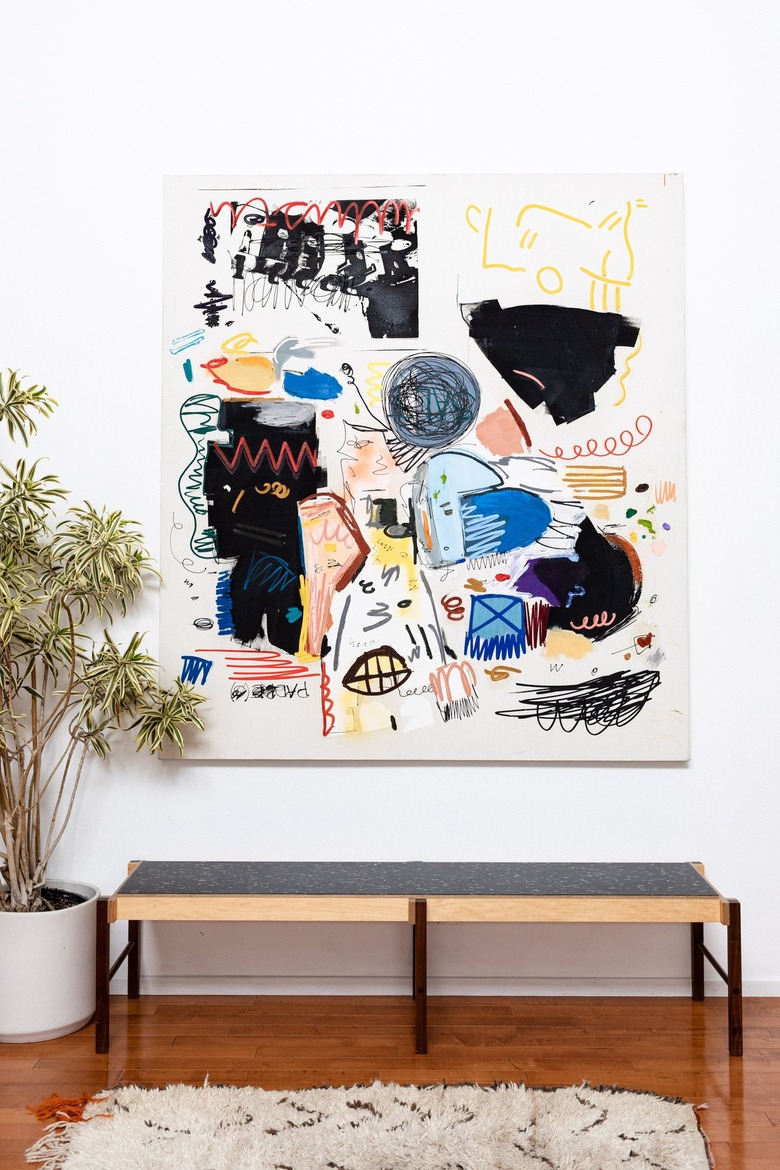 The light-filled, open loft space is covered from floor to ceiling in artwork. An enthusiast of emerging contemporary artists, Holly loves heading to Tappan Collective to find new and exciting work. Not afraid of bold statement pieces, a massive Jonni Cheatwood painting hangs above a Doug McCollough Lino Bench they scored from The Line. "These two pieces were meant to be together" she says.