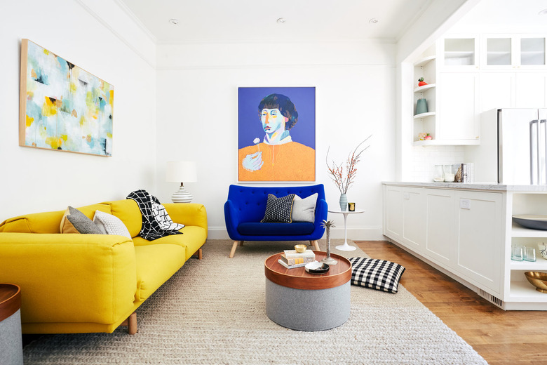 The couple's vibrant artwork set the tone for the design of the living room. "The purple and orange in the portrait painting was an extremely colorful combination," says Jung. "Instead of trying to soften the rest of the living room palette to a neutral scheme, we fully embraced the bold colors by installing a complementary and equally bold yellow sofa."