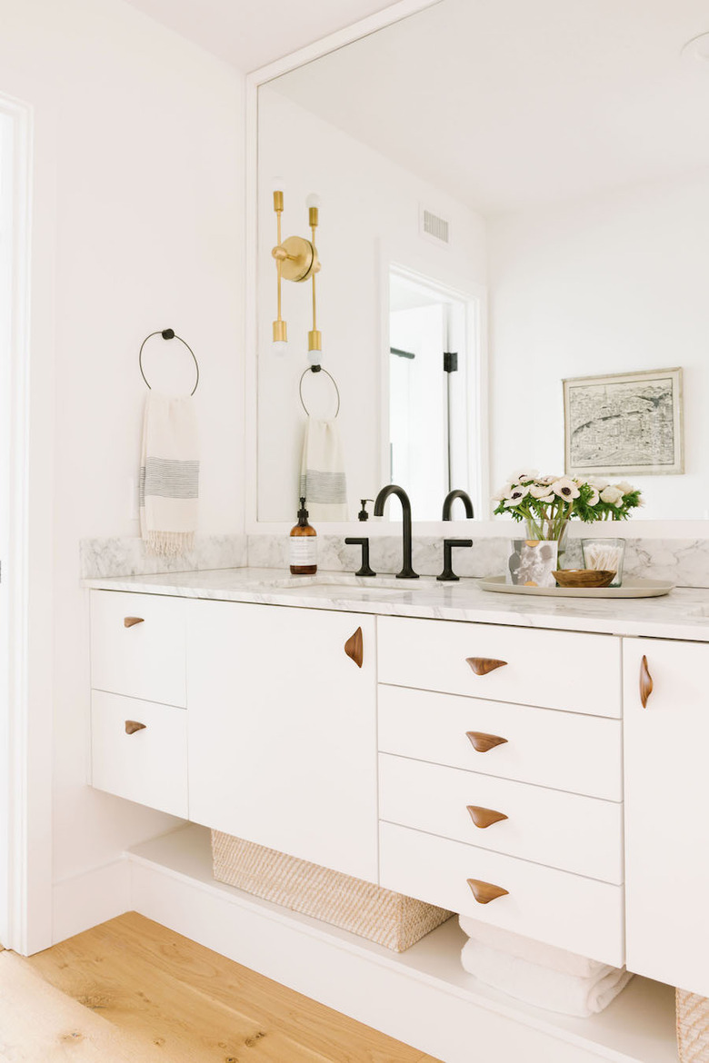 In this gorgeous white space styled by the team over at Decus Interiors, the console bathroom sink is a picture-perfect addition, and the black legs are a nice contrast to other gleaming accents.