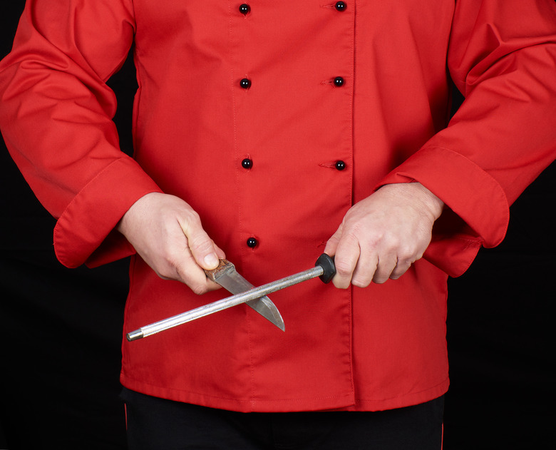 A knife sharpening steel is a long rod that looks a bit like a round file, often included with sets of knives. This tool is best for keeping a knife sharp when it becomes slightly dull; it's not the right tool for the job when a knife is completely dull and practically useless. A sharpening steel helps "reset" the blade so its cutting edge is fairly even across the length of the blade.