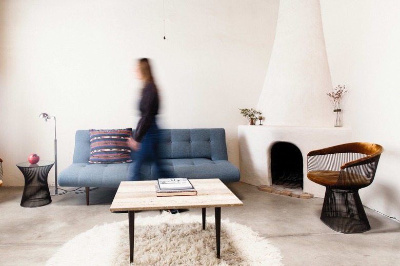 The property consists of a rowhouse building that's split into two residences. The smaller one, Adobe Libre, is a shotgun apartment that's about 800 square feet with one bedroom, one bath. The Root Beer Adobe is about 1,700 square feet, with two bedrooms and one bath. Both spaces have high ceilings, plenty of natural light, striking fireplaces, exposed beams, and raw adobe walls. Since the overall feel of the architecture is so warm and earthy, Jabczenski likes to keep the decor more modern and minimal to accent the bones of the home. "It feels reminiscent of Georgia O'Keefe's properties in New Mexico, which is interesting, because after working in those spaces, I learned she didn't have much furniture either," she says.