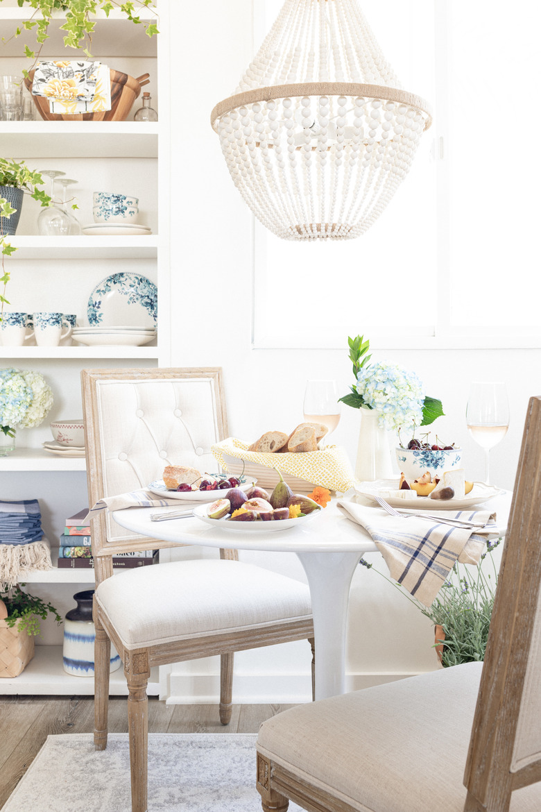 A subdued palette of off-whites and refined blues sets the stage for our casual-yet-stylish scene. By mixing eras — a midcentury-inspired table with rusticated Louis-style chairs and boho touches — the space takes on an eclectic charm that recalls chic finds from antique markets and family heirlooms.