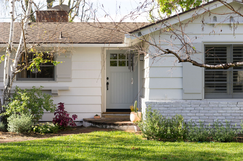 "Having colors that are neutral enough to accent with warm or cool tones is the trick," Jamie Davis, co-founder and owner of Portola Paints & Glazes, tells Hunker. "I do however love to repaint my front door semiregularly." Davis recommends exterior paint colors like Portola's Stone 1 and Stone 3 (seen here on the house's shutters) and Half Dome (used on the front door) to achieve this look.