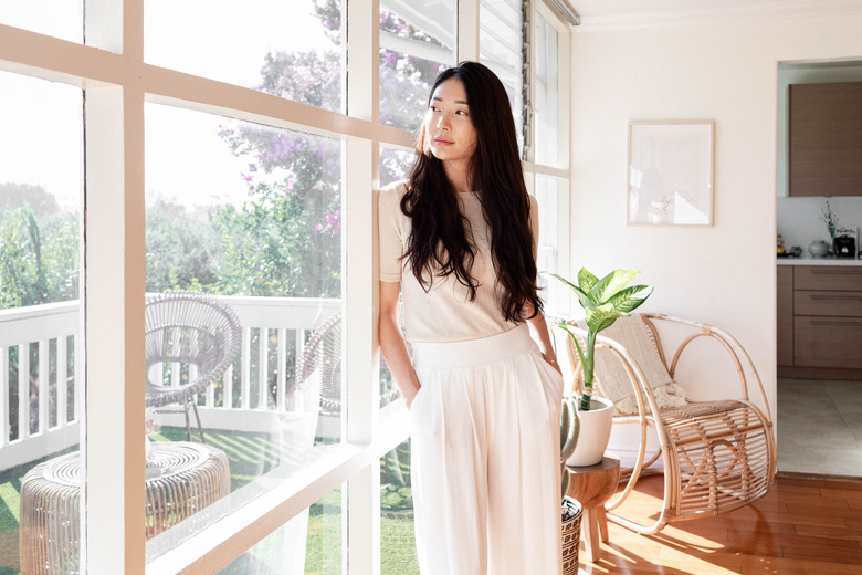 The first thing you notice when you step inside Candace Kim's Pasadena home is the epic view. Unique floor-to-ceiling windows give way to a sun-drenched view of lush greenery and the San Gabriel mountains. Inside, the tropical plants, Brazilian cherry wood flooring, and eclectic rattan pieces create a similar ambiance — bringing the outdoors in, with natural, sustainable materials and earthy tones. As the founder of sustainable lifestyle brand Selah, it's not just an aesthetic choice, it's also an intentional one. Much of the house was furnished with her own pieces — reflecting her commitment to sustainability. "Each product is purposeful in its design, material, and use. Everything is made from natural materials, from raw wood to natural dye linens and making good use of deadstock fabric," she says.
