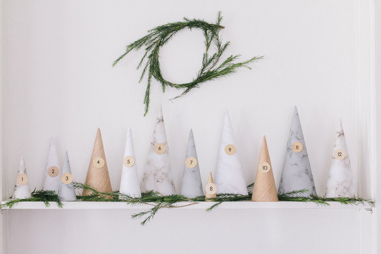 Celebrate the countdown to Christmas with a winter wonderland of pretty paper. Being a hub for all things concerning the home, our modern spin on the advent calendar is a nod to the natural surfaces you'd encounter in a home: wood and stone. With an assortment of marble patterns and light oak tones, this gorgeous paper forest and its neutral palette would play well with your existing decor. Personally, we think it'd make a lovely holiday display on your mantel, shelf, or table. Simply hide tiny treats or festive notes under each cone, tuck a few sprigs of greenery around the "trees" to create a forest feel, and let the merriment begin.