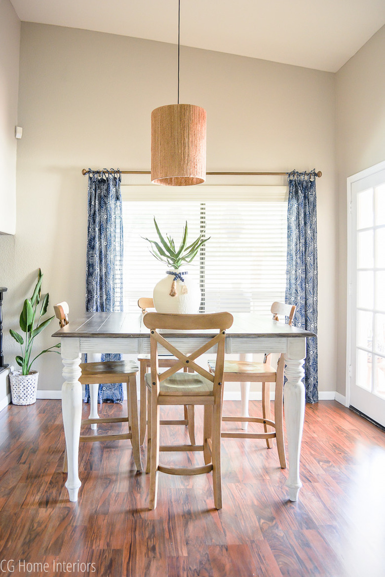 The hint of taupe in classic greige shades lends itself well to natural accents. Interior designer Christina Goldsmith pairs Behr's Wheat Bread with a rattan lamp, natural wood chairs, and hints of greenery to create an earthy breakfast room. Sheer blue curtains add just enough color to keep the eye interested.
