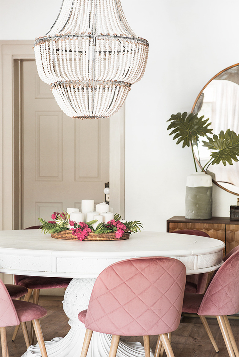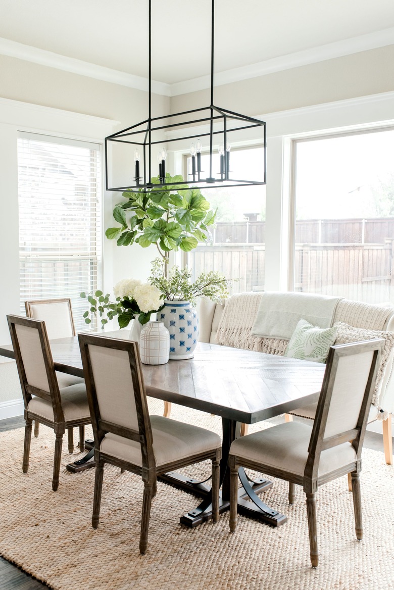 No shade suits a classic, elegant dining room than the perfect greige — like PPG Paints' Whiskers, pictured here in Simplicity for Designs' living room. The natural woven rug and fiddle-leaf fig keep the space grounded, but the tufted bench and upholstered chairs add unparalleled elegance and luxury.