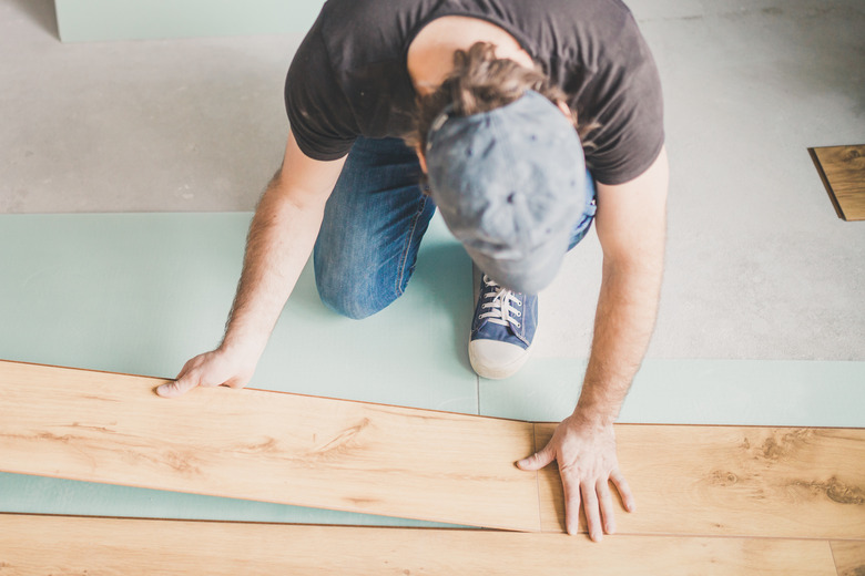 By contrast, laminate flooring planks are designed to fit together with notches and grooves along the length of each plank. Some products have an underlayment already attached; others require that you install an underlayment over the substrate before installation. Laminate must be acclimated, or left to sit, at room temperature for 48 hours before installation. Laminate expands and contracts when installed since it is a floating floor, not glued down. Installation typically begins along the longest (focal) wall, rather than in the center of the room. Stagger the planks as you would with wood flooring, trimming the first and last pieces that butt against the end walls ahead of time.